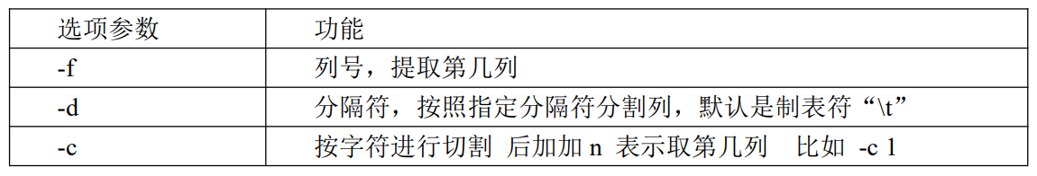 - cut 命令从文件的每一行剪切字节、字符和字段并将这些字节、字符和字段输出。