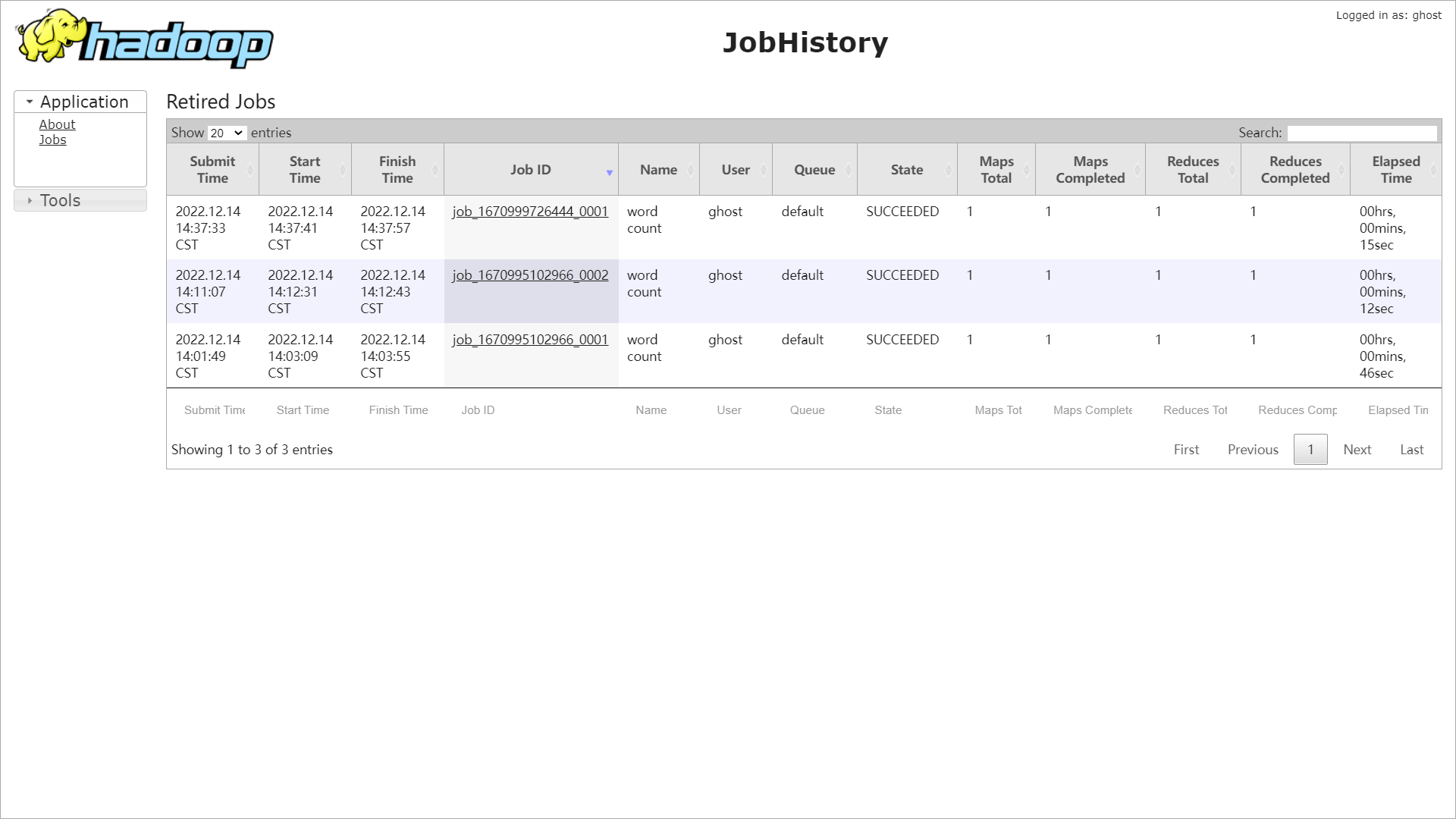1 | [ghost@hadoop100 hadoop-3.3.4]$ hadoop jar share/hadoop/mapreduce/hadoop-mapreduce-examples-3.3.4.jar wordcount /input /output |