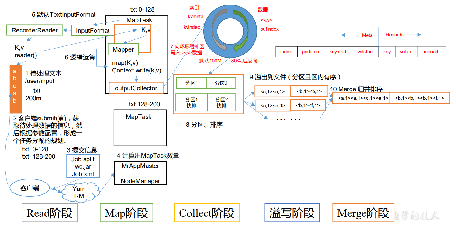 (1)Read 阶段:MapTask 通过 InputFormat 获得的 RecordReader,从输入 InputSplit 中 解析出一个个 key/value。