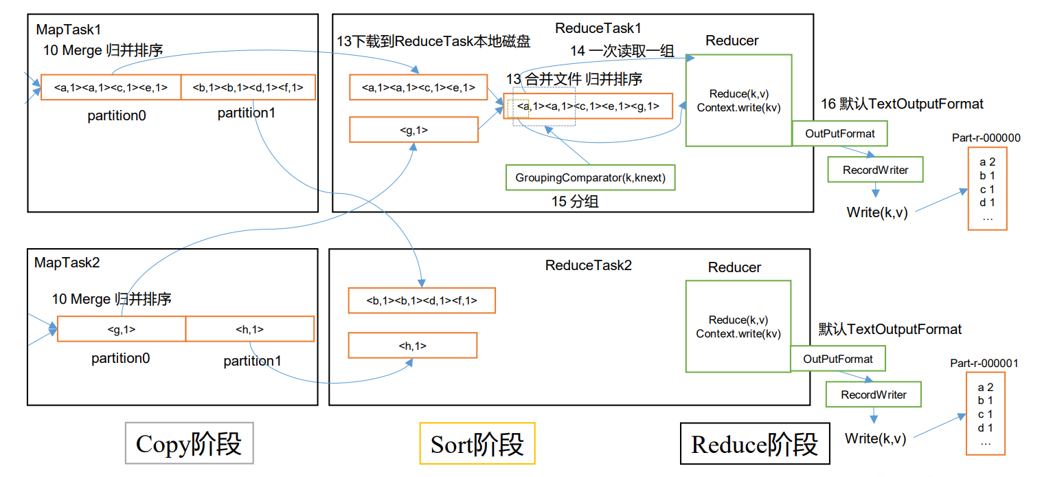 (2)Sort 阶段:在远程拷贝数据的同时,ReduceTask 启动了两个后台线程对内存和磁 盘上的文件进行合并,以防止内存使用过多或磁盘上文件过多。按照 MapReduce 语义,用 户编写 reduce()函数输入数据是按 key 进行聚集的一组数据。为了将 key 相同的数据聚在一 起,Hadoop 采用了基于排序的策略。由于各个 MapTask 已经实现对自己的处理结果进行了 局部排序,因此,ReduceTask 只需对所有数据进行一次归并排序即可。