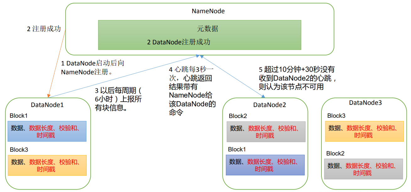 (2)DataNode 启动后向 NameNode 注册,通过后,周期性(6 小时)的向 NameNode 上 报所有的块信息。