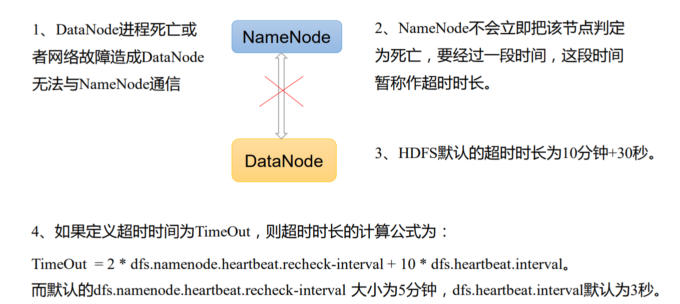 (3)心跳是每 3 秒一次,心跳返回结果带有 NameNode 给该 DataNode 的命令如复制块 数据到另一台机器,或删除某个数据块。如果超过 10 分钟没有收到某个 DataNode 的心跳, 则认为该节点不可用。