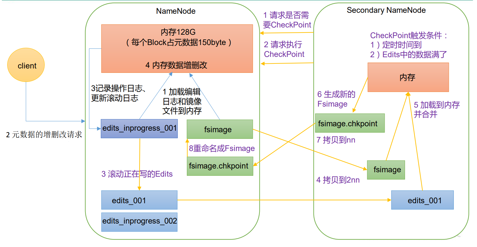 这样又会带来新的问题,当在内存中的元数据更新时,如果同时更新 FsImage,就会导 致效率过低,但如果不更新,就会发生一致性问题,一旦 NameNode 节点断电,就会产生数 据丢失。因此,引入 Edits 文件(只进行追加操作,效率很高)。每当元数据有更新或者添 加元数据时,修改内存中的元数据并追加到 Edits 中。这样,一旦 NameNode 节点断电,可 以通过 FsImage 和 Edits 的合并,合成元数据。