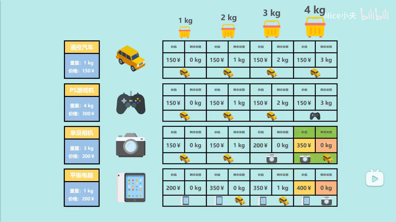 在给定约束条件下找到最优解。在上面的问题中,你必须在购物篮容量给定的情况下,拿到价值最高的商品。 在问题可分解为彼此独立且离散的子问题时,就可以采用动态规划来解决。每种动态规划解决方案都涉及网格表格中的值通常就是要优化的值。在上面的问题中,表格的值为商品的价值。每个表格都是一个子问题,因此你应该考虑如何将问题分成子问题,这样有助于找出网格的坐标轴。