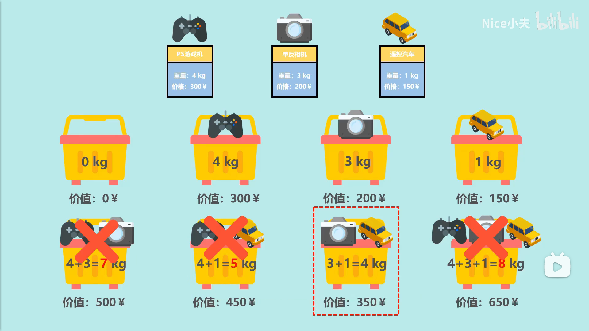 假设有一个可容纳4kg商品的购物篮,现有四件商品可供选择,如何装购物篮的价值最高?