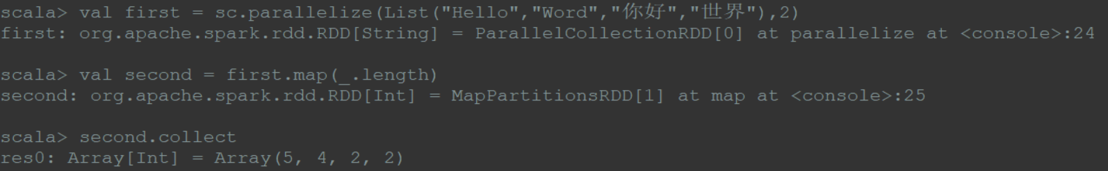 1 | val first = sc.parallelize(List("Hello","Word","你好","世界"),2) |
