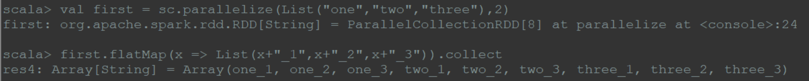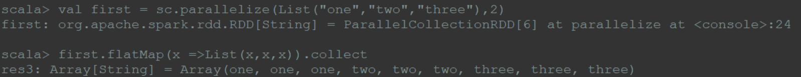 1 | val first = sc.parallelize(List("one","two","three"),2) |