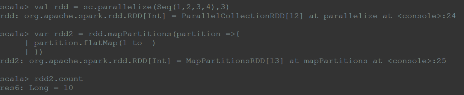 1 | val rdd = sc.parallelize(Seq(1,2,3,4),3) |
