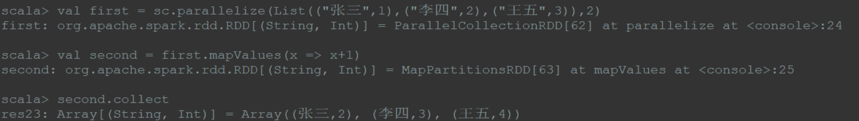 1 | val first = sc.parallelize(List(("张三",1),("李四",2),("王五",3)),2) |