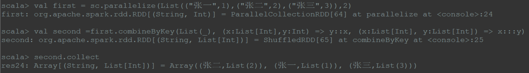 1 | val first = sc.parallelize(List(("张一",4),("张一",2),("张三",3)),2) |