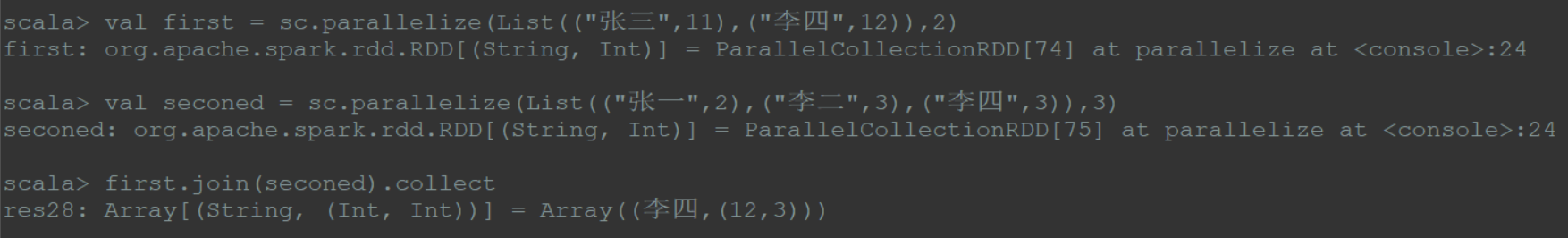 1 | val first = sc.parallelize(List(("张三",11),("李四",12)),2) |