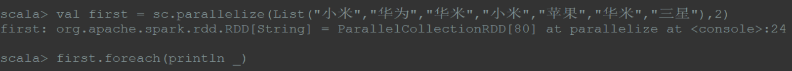 1 | val first = sc.parallelize(List("小米","华为","小米","华硕","很郁闷"),2) |