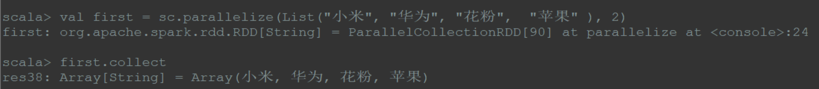 1 | val first = sc.parallelize(List("小米", "华为", "花粉", "苹果" ), 2) |