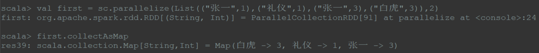 1 | val first = sc.parallelize(List(("张一",1),("礼仪",1),("张一",3),("白虎",3)),2) |