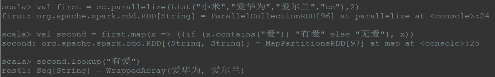 1 | val first = sc.parallelize(List("小米","爱华为","爱尔兰","cs"),2) |